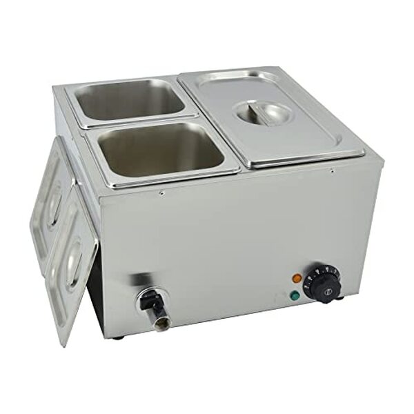 TAIMIKO Bain Marie électrique en Acier Inoxydable 220V Chauffe-Plats Professionnel Commercial avec 3 Bacs Casseroles avec Robinet de vidange Contrôle de la température【3 Pots De Grande Capacité】Bain marie professionnel avec 3 casseroles et 3 couvercles,chaque pot a une taille intérieure de 32.5*17.6*14.8 cm.Dessert un grand nombre de personnes en même temps,convient pour une variété de plats, utilisés dans les cuisines, les restaurants, les hôtels ou les prestataires de services de restauration 【Interchangeable & Compartiment Design】Notre base de chauffe-aliments buffet qui fonctionne avec des compartiments de taille standard de 6 pouces de profondeur de toutes tailles, interchangeables pour convenir à toutes les occasions 【Résistant à l'Acide Alcal Acier Matériau】Bain marie en acier inoxydable de qualité alimentaire,déformation anti-compression et anti-chute,résistant à la corrosion et très facile à nettoyer.Haute densité, pas de fuite, atténuer l'augmentation soudaine de la température 【Chauffage De l'Eau Et Température Constante】Équipé d'un thermostat,commande Simple Par Bouton,transfert de chaleur rapide,la température est réglable en continu entre 30 et 80 ° C.Le chauffage de l'eau permet une fonte uniforme et un changement de température progressif.Sonde de contrôle de température intégrée,le chauffage et l'arrêt pour maintenir une température constante 【Design innovant】Renforcement du rivet,résistant à l'extrusion et à la déformation;Robinet de vidange en acier inoxydable,drainage facile;vous pouvez en utiliser pour la fonte du lait ou de la crème, chocolat, confiture, savons artisanaux, cire de beauté. Convient à diverses occasions
